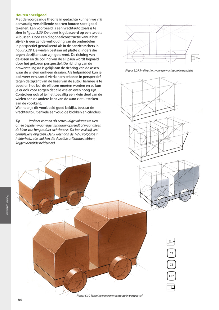 In dit boek wordt de basis uiteengezet van producten tekenen in perspectief. Verwacht geen geavanceerde conceptschetsen van auto’s of boten maar de belangrijke aandachtspunten van verschillende soorten perspectief, hoe je eenvoudige blokken en cilinders correct kunt tekenen en inkleuren om ze ruimtelijk te laten lijken en hoe je verschillende basisvolumes kunt combineren tot een eenvoudig product. Hierbij wordt gebruik gemaakt van gangbare materialen binnen de wereld van het ontwerpen van producten en machines.